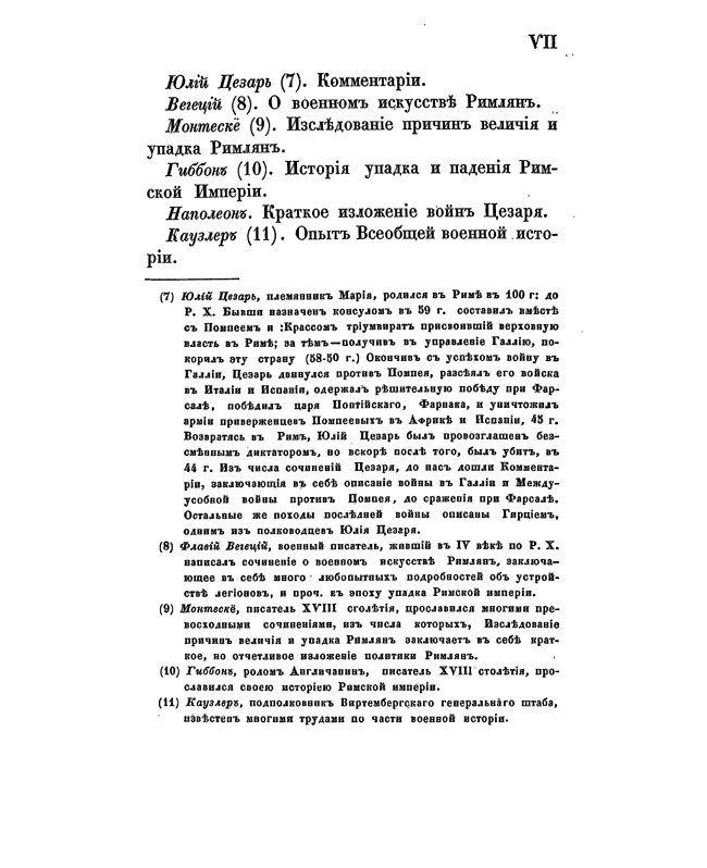 Автор рассматривает только те военные события, которые имели влияние на судьбу народов исторического мира или развитие военного искусства. В истории военного искусства он выделяет следующие периоды: Греческий – от Троянской войны (1194 – 1184 до Р. Х.) до покорения Римлянами Греции (146 г. до Р. Х.); Римский – от основания Рима (754 г. до Р. Х.) до падения Западной Римской империи (476 г. по Р. Х.); период постепенного возрождения военного искусства – от падения Западной Римской империи до Густава Адольфа или начала 30-летней войны (1618 г.); период новейшей военной истории – от начала 30-летней войны до настоящего времени. Период новейшей военной истории в издание не вошел.